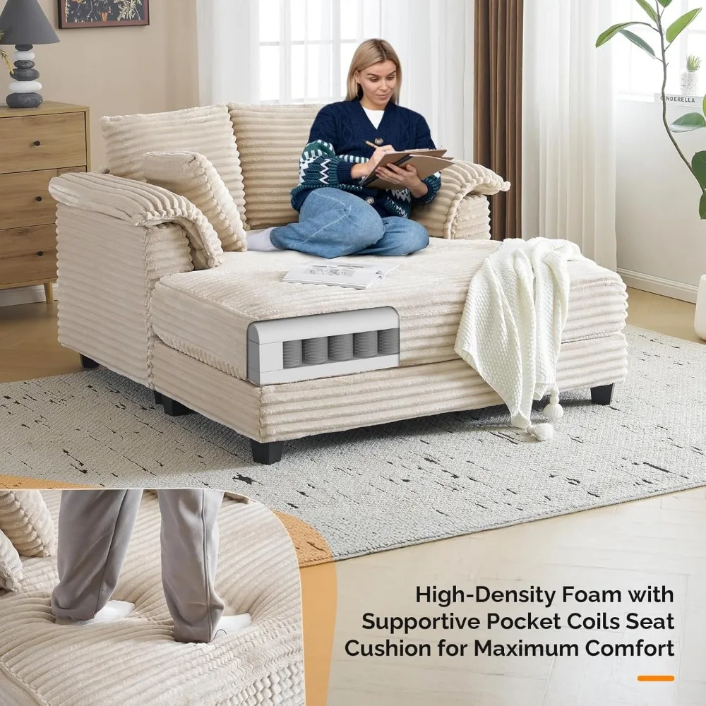 56" Oversized Chaise Lounge Chair, Beige Comfy Corduroy Chaise Sofa Recliner Bed Upholstered Sleeper Couch Bed with Throw
